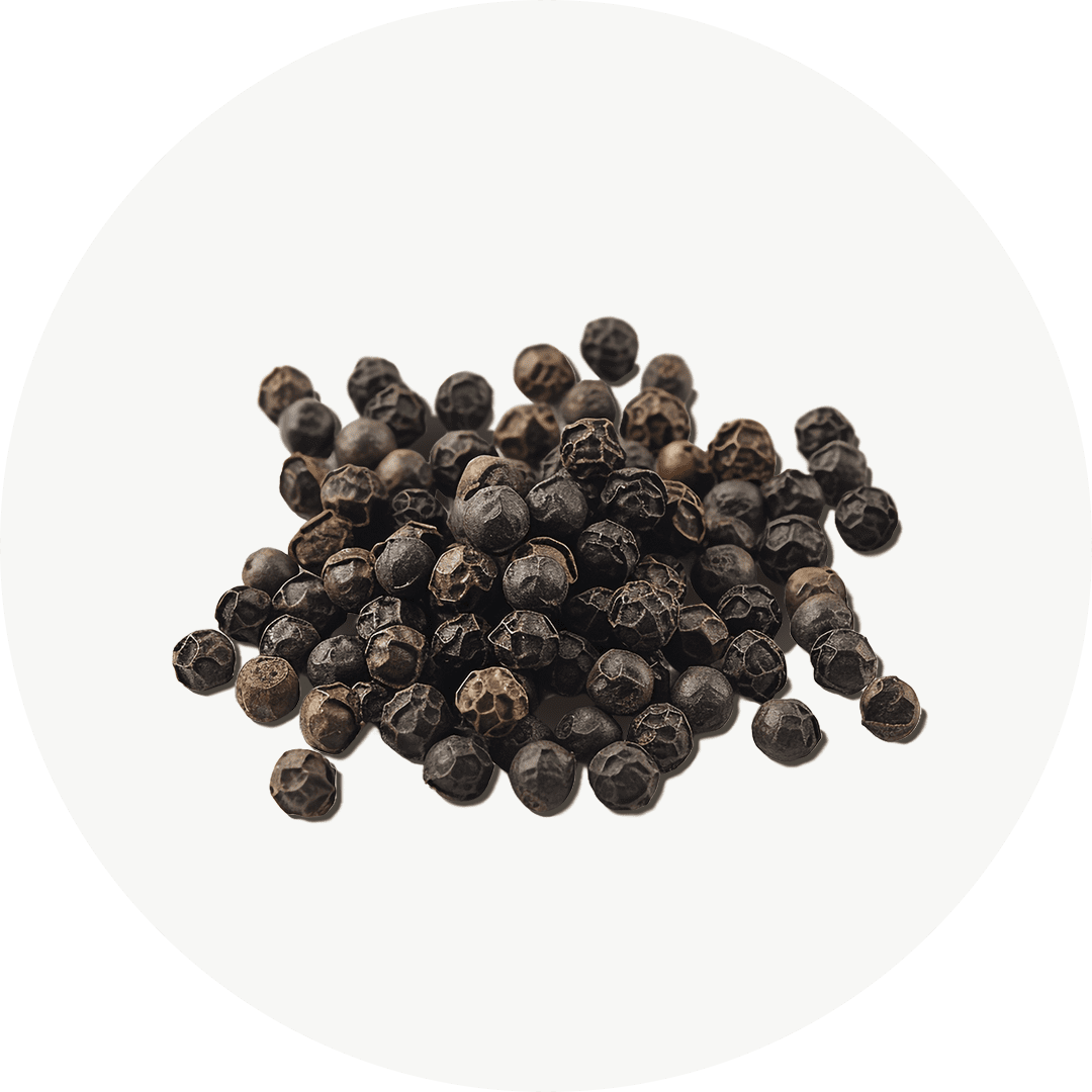 La pimienta negra, especialmente su componente activo, la piperina, se utiliza en complementos alimenticios como ashwagandha o cúrcuma para mejorar la absorción y eficacia de estos ingredientes. La piperina aumenta la biodisponibilidad de estos compuestos, lo que permite que el cuerpo los aproveche mejor. Esto potencia los beneficios antiinflamatorios, antioxidantes y de mejora del bienestar