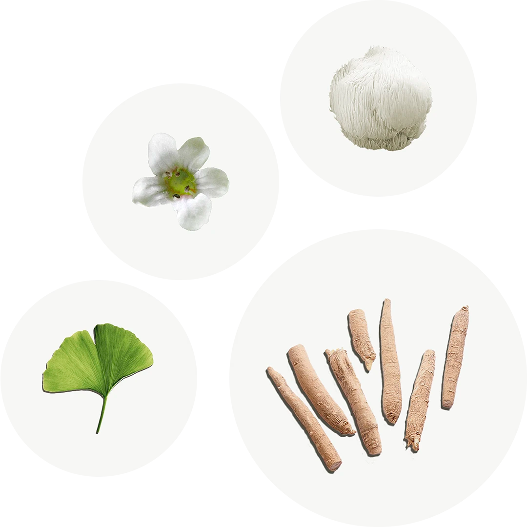 L-Tirosina, extracto seco de planta entera de Bacopa (Bacopa monnieri (L.) Wettst) 40 % bacósidos, L-Teanina, Cápsula vegetal (agente de recubrimiento: hidroxipropilmetilcelulosa), Cafeína anhidra, extracto seco de hojas de Ginkgo (Ginkgo Bloba L.) 24 % glucósidos flavonoides, extracto seco de esporóforo de Melena de león (Hericium erinaceus (Bull.) Pers.) 20 % polisacáridos, extracto seco de partes aéreas de Huperzia serrata (Thunb.) Rothm. 0,2 % huperzina, agente de carga (celulosa microcristalina).